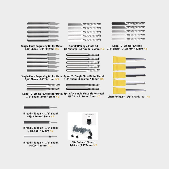 Lieferumfang: Fräsertyp Spezifikation Anzahl Einzahn-Gravierfräser für Metall 1/8" Schaft - 30° * 0.2mm 5 Spiral 'O' Einzahnfräser 1/8" Schaft - 3.175mm * 25mm 5 Spiral 'O' Einzahnfräser 1/8" Schaft - 3.175mm * 42mm 5 Einzahn-Gravierfräser für Metall 1/8" Schaft - 60° * 0.1mm 5 Spiral 'O' Einzahnfräser für Metall 1/8" Schaft - 3.175mm * 12mm 5 Spiral 'O' Einzahnfräser für Metall 1/8" Schaft - 2mm * 8mm 2 Spiral 'O' Einzahnfräser für Metall 1/8" Schaft - 1mm * 3mm 2 Fasenfräser 1/8" Schaft - 90° 5 Gewindefräser 1/8" Schaft M3 (d2.4mm) * 9mm 1 Gewindefräser 1/8" Schaft M4 (d3.15) * 12mm 1 Gewindefräser 1/8" Schaft M5 (d4) * 15mm 1 Fräswerkzeug-Hülsen 1/8" (3.175mm) 100 Stück