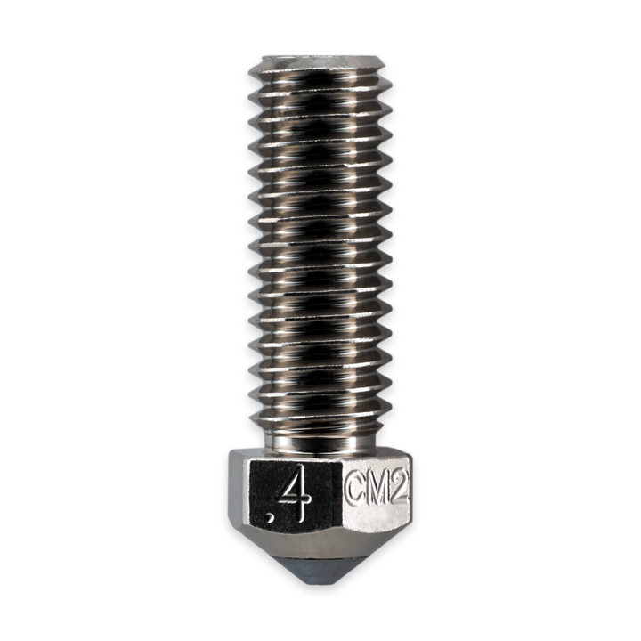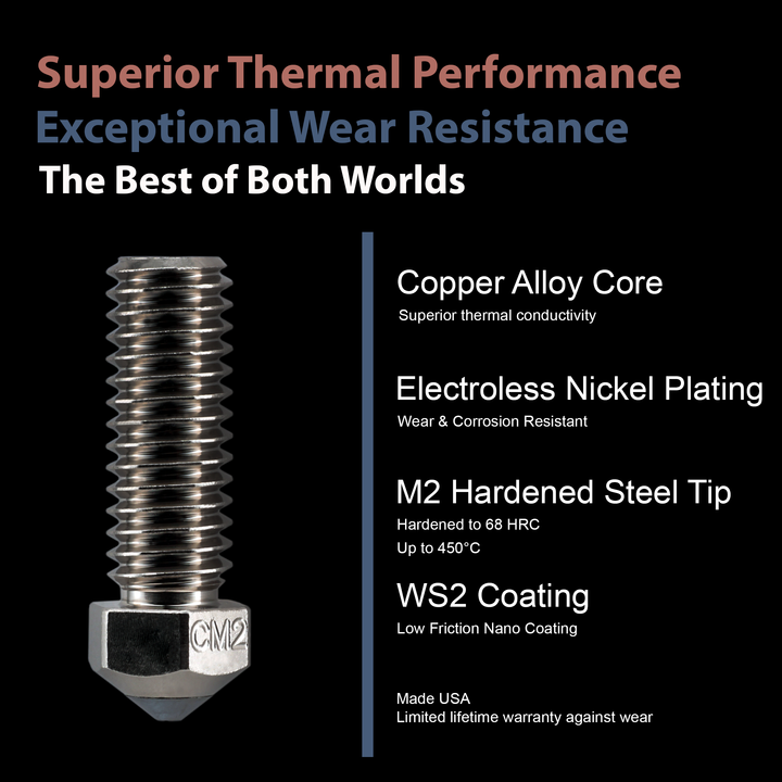 Die CM2 Düse kombiniert hohe Temperaturbeständigkeit mit maximaler Verschleißfestigkeit. Während herkömmliche Kupferdüsen bei hohen Temperaturen an Festigkeit verlieren, bleibt das spezielle Kupfer-Chrom-Zirkonium-Gemisch auch bei anspruchsvollen Anwendungen stabil. Die gehärtete Stahlspitze widersteht abrasiven Filamenten wie Carbonfaser oder Glasfaser, während die Nano-Beschichtung Anhaftungen minimiert.
