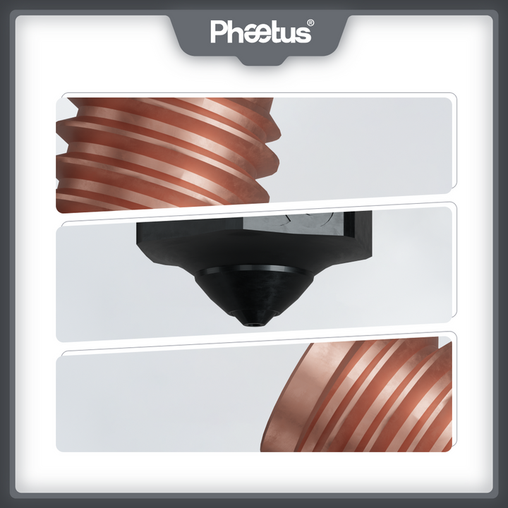 Die flache Düsenspitze aus 99,9% hochreinem Siliziumkarbid sorgt für eine hohe Wärmeleitfähigkeit, was die Effizienz der Düsenheizung erhöht und somit schnelles Drucken ermöglicht. Die spezielle Nietenmontage des Siliziumkarbid-Tips gewährleistet eine stabile und zuverlässige Verbindung. Das gesamte Design des Düsenkörpers sorgt für hohe Festigkeit und verhindert Brüche. Darüber hinaus ist die gesamte Düse mit einer DLC-Beschichtung versehen, deren Oberflächenreibungskoeffizient nur 0,05 beträgt, was ein sauberes Drucken ohne Anhaften von Kunststoff ermöglicht. Die hohe Präzision der Düsenbearbeitung sorgt für eine Bohrungsdimensionstoleranz von 0,01 mm bei einer Konzentrizität von 0,02 mm.