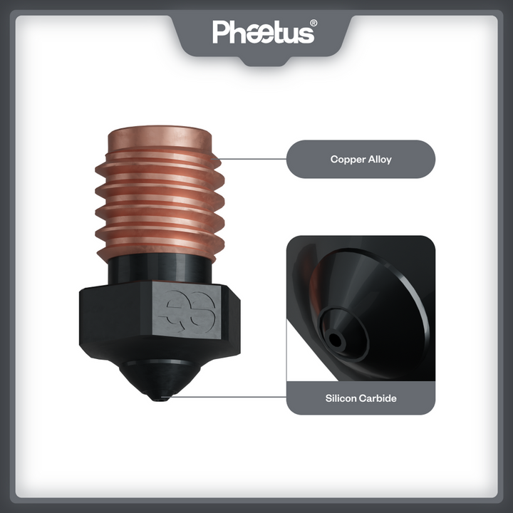 Die Silicon Carbide Düse erfüllt alle Druckanforderungen, egal ob Sie mit normalem PLA, PEEK oder sogar mit kohlenstofffaserverstärkten Materialien arbeiten. Hergestellt aus 99,9% hochreinem Siliziumkarbid, bietet die Düse eine hohe Temperaturbeständigkeit und außergewöhnliche Verschleißfestigkeit. Dies gewährleistet eine lange Lebensdauer von bis zu 550 Druckstunden, ohne dass es zu Abnutzungen an der Düsenöffnung oder der Düsenspitze kommt.